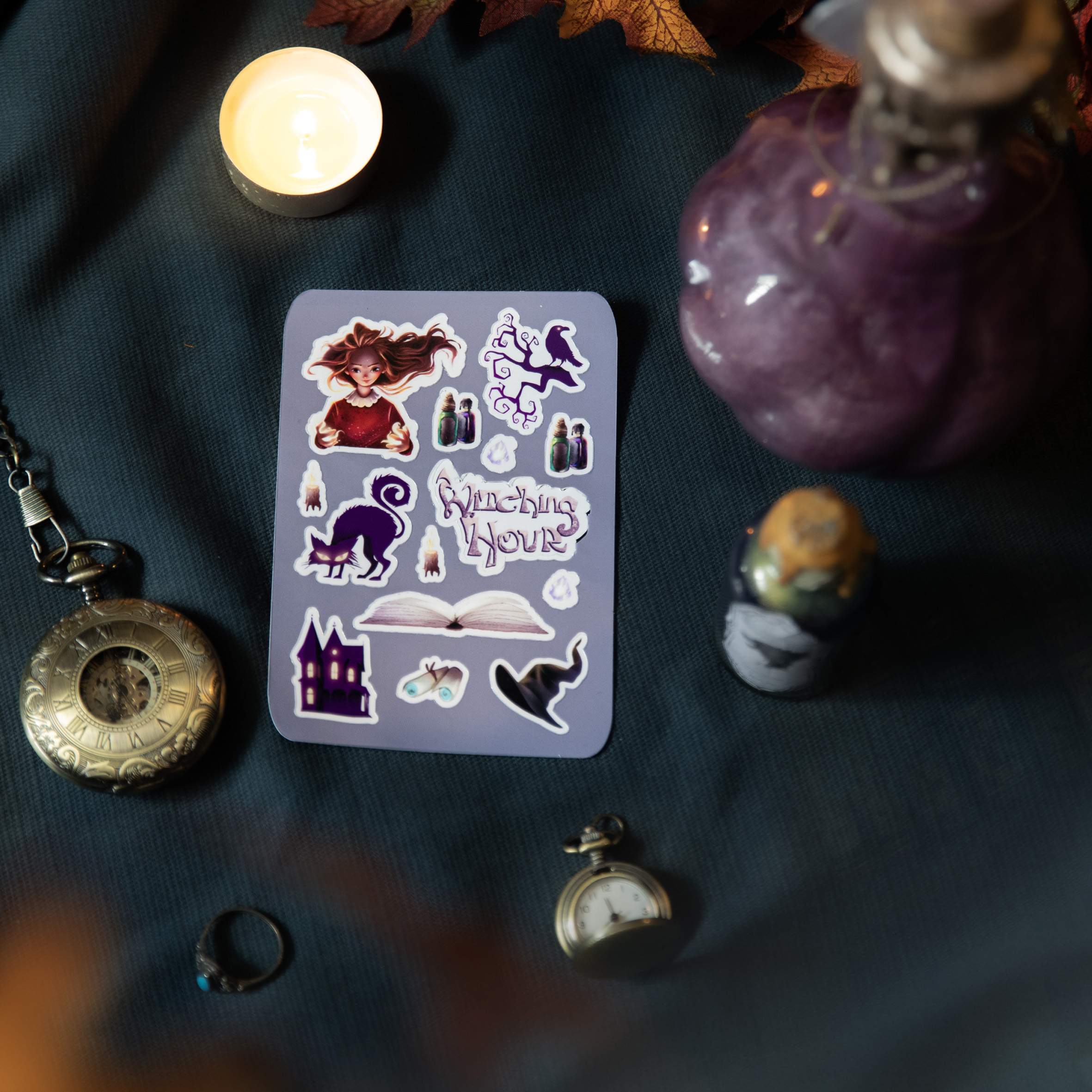 Chat noir, bougies, chapeau pointu… chaque illustration a été pensée comme un petit talisman à coller sur ton carnet, ta liseuse ou tes lettres secrètes.